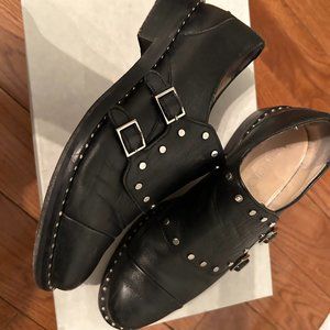 Elegant black shoes with silver studs. Features double buckle design. Perfect for stylish occasions.