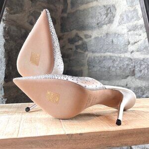 Beige/champagne satin with clear crystal embellishments. Pointy toe. High stiletto heels. Beige leather insole. Made in Italy. Come with a dustbag.
