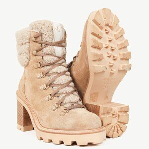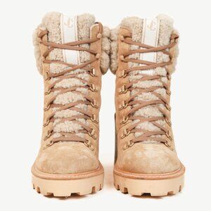 The Eshe hiking boots from Jimmy Choo are crafted in a Stucco beige suede, and feature stacked block low heels, closed rounded toes, front lace-up detailing, shearling trim, logo grosgrain trim on the tongue, leather lining, and rubber lug outsoles.