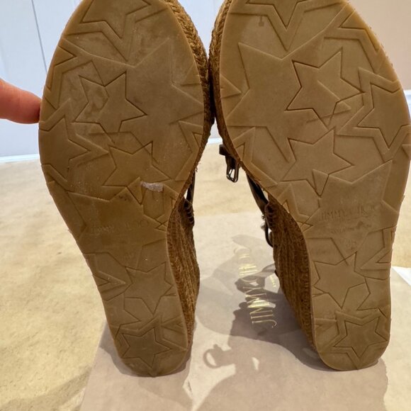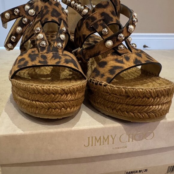 EUC. Jimmy Choo Danica Espadrille Wedge Leopard-print Suede Sandals. Faux pearl, studded, rubber sole, 100% leather. Barely worn. In excellent condition.