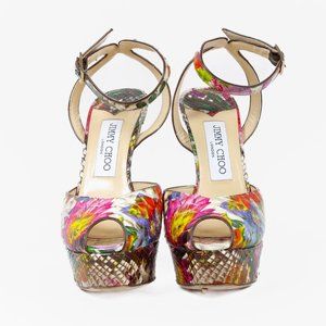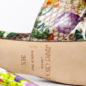 Crafted from genuine python leather, these Jimmy Choo platforms sandals feature an allover multicolour floral print, an almond peep toe, beige leather soles, an ankle strap with buckle closure, and a platform with a stiletto heel.
