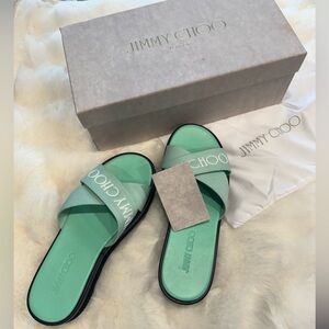 Jimmy Choo 💚 Green Canvas Logo Wedge Sandals