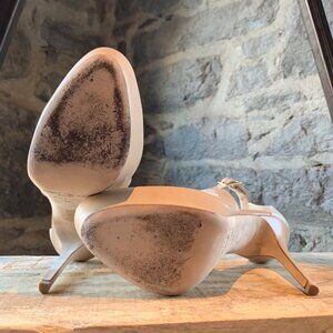 Bi-colour leather platform heels. Almond toe. Leather soles and insoles. Cut out effect. Adjustable at ankle. Made in Italy. Come with the original box.