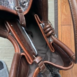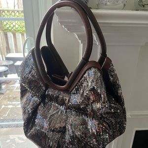 While Jimmy Choo often does sequins, he rarely combines them with leather. With this bag, you get them both - it has been authenticated. A really beautiful Jimmy Choo rich brown leather trimmed hobo with beautiful complimentary sequins adorning the body of the bag. It fastens with a leather strap across the top and has a small pocket for lipsticks etc. Measurements are as follows.