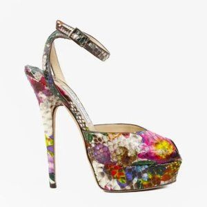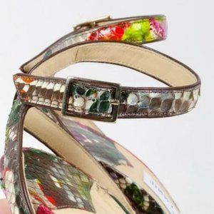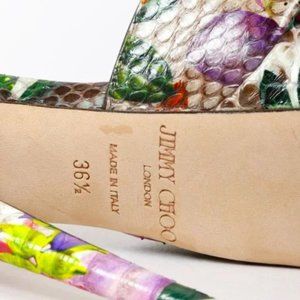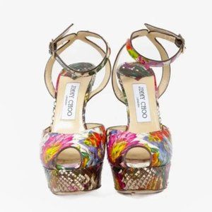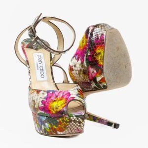 Crafted from genuine python leather, these Jimmy Choo platforms sandals feature an allover multicolour floral print, an almond peep toe, beige leather soles, an ankle strap with buckle closure, and a platform with a stiletto heel.