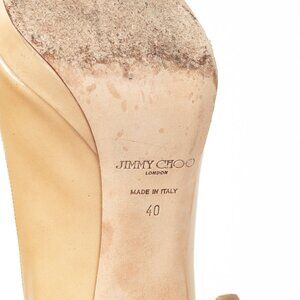 Made in Italy, these Luna pumps from Jimmy Choo are crafted in a tan patent leather, and feature covered stiletto high heels, almond peep toes, tonal stitching, and leather lining and soles.