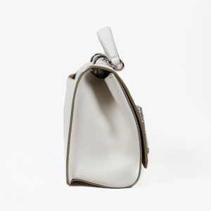 Jimmy Choo Madeline bag flaunts a beautiful structured silhouette with a round top handle, polished silver-tone hardware, an exterior rear pocket, a top flap with magnetic closure, and a large and eye-catching buckle at the front embellished with clear crystals. The interior is lined with soft suede in grey and equipped with a zip pocket. The Madeline bag comes with a detachable leather shoulder strap.