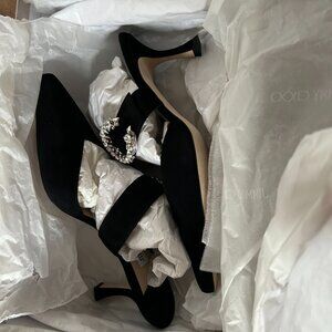 Never Worn. Marta 70 Suede Pump In Black Suede And Silver-Tone Hardware With Crystal-Embellished Buckle Lightly Padded Leather Insole Smooth Leather Sole 3.5In Heel