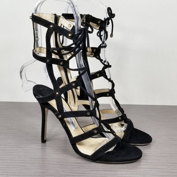 Jimmy Choo Meddle Cage Gladiator Sandal, Black Suede, Womens Size 7.5 / 37.5