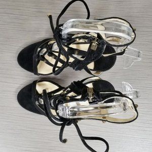 The black beauties are crafted from suede and feature an open toe silhouette. They flaunt a gladiator design with gold-tone studs adorning the straps and lace-ups that run from the middle up to the top. Comfortable leather lined insoles and 11 cm stiletto heels complete this stunning pair.