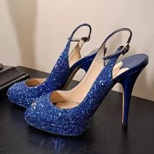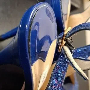They do show some light wear, as seen in the photos, but are still in very nice shape and blemishes don't show when worn. The heels are in good shape, showing little wear. Very slight glue lifting on the blue area under your heel at the back. Will come with a shoe bag, but no original box.