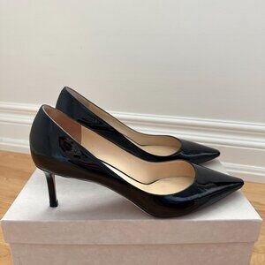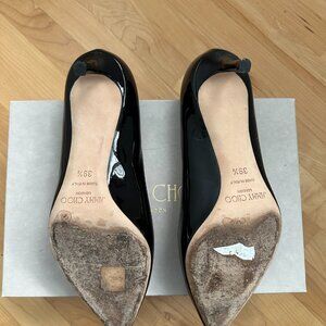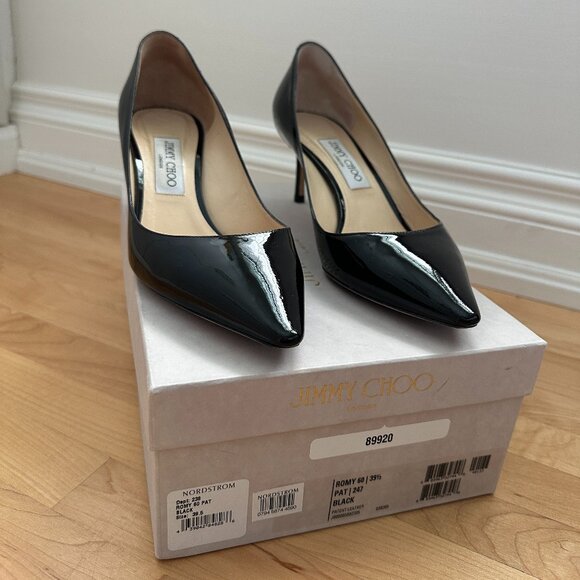Jimmy Choo patent leather black Romy 60 heels in size 39.5. A few minor marks on the heels which I have photographed. These are such comfy heels!