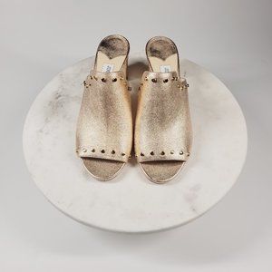 Jimmy Choo Rose Gold Leather Mules & Clogs with open round toe silhouette crafted in Italy from metallic rose gold-tone leather, and punctuated with gold studs that heighten the sense of glamor, while the mid-heel provides sturdy elevation for a comfortable fit. Size 38.5. Heels is around 2.5 inches.