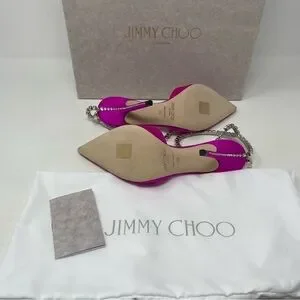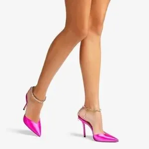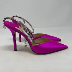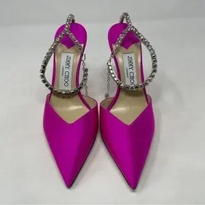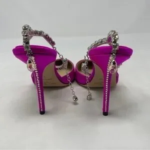 Jimmy Choo Saeda 100mm Ankle Strap Pumps in Fuschia Satin with Crystal Chain