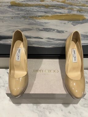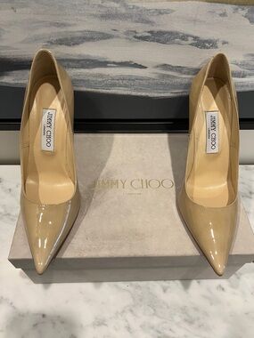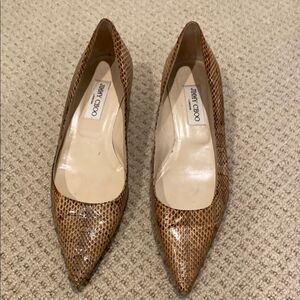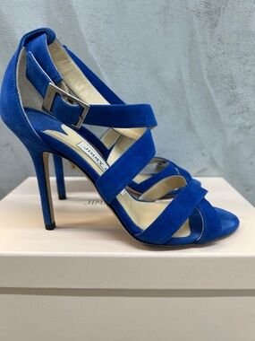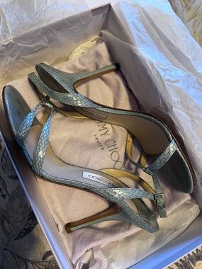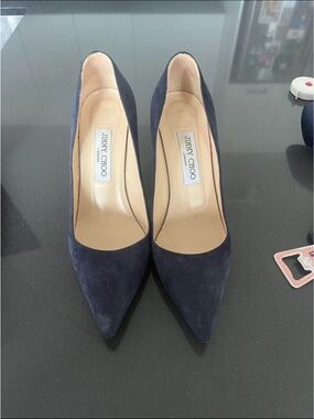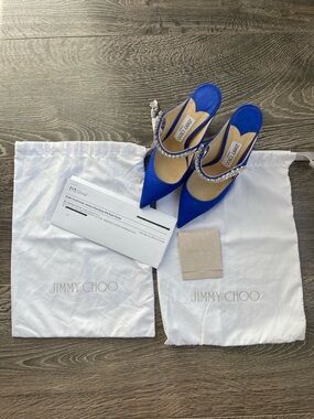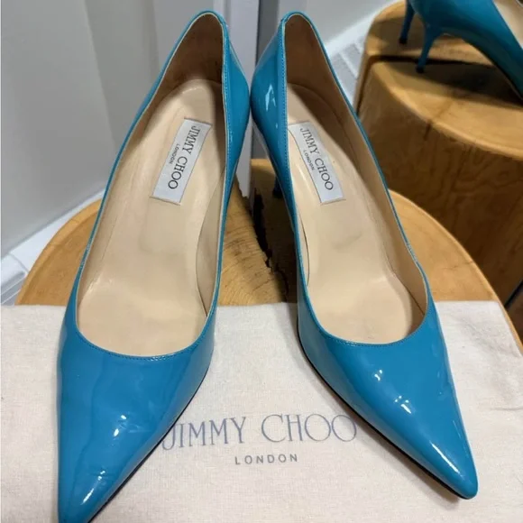 Visible wear and tear on heel. Chic two tone teal heels by Jimmy Choo. Sleek design with pointed toe. Perfect for elevating any outfit.