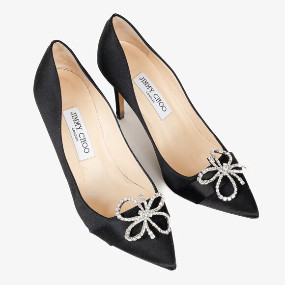 Jimmy Choo Veil 85 Black Satin Crystal-Bow Pumps, Size 7.5