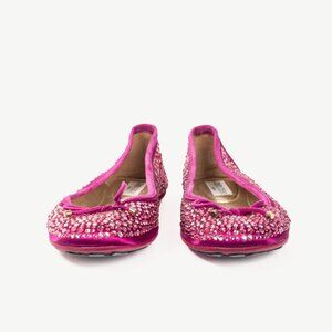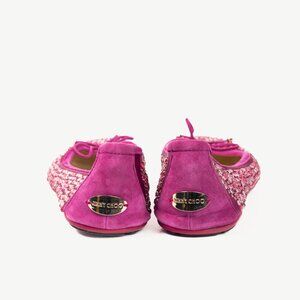 Made in Italy, these Weber ballet flats from Jimmy Choo circa 2012 are crafted in a fuchsia satin embellished all over, and feature tonal suede trim, closed rounded toes with bow detailing, leather lining, and rubber outsoles.