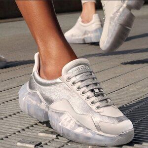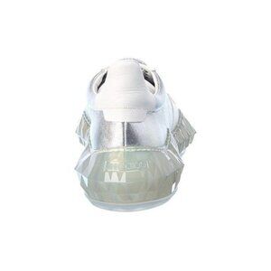 Sneaker in silver and white leather and silver-tone hardware with metallic laces and textured transparent sole