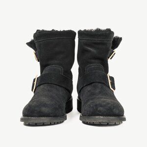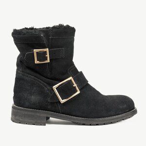 Made in Italy, these Youth boots from Jimmy Choo are crafted in a black suede, and feature flat block heels, closed rounded toes, buckled straps, shearling and leather lining, and rubber outsoles.
