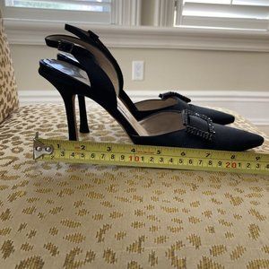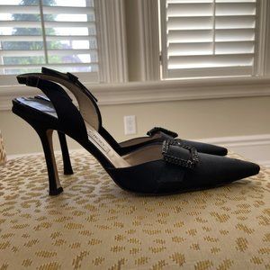 Black Jimmy Choo pumps, approx 4 inch height, size 39 European (approx 8 US), slingbacks with rhinestone buckle