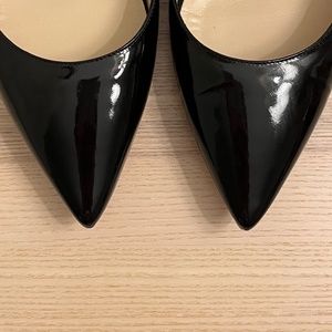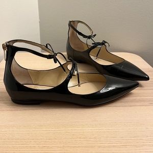 These elegant Jimmy Choo ballet flats will be your favourite go-to option for any special occasion. They have been crafted from patent leather. They are styled with pointed toes, double bow-detailed ankle straps, and zip fastening on the counters.