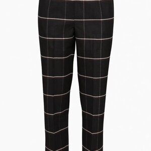 Style tags: pants, slacks, trousers, plaid, tartan, black, beige, burgundy, maroon, pattern, squares, tattersall, neutral, Canadian brand, warm, event, business casual, small, petite, professional, dark, rich, goth, punk, noir, grunge, workwear, Aritzia, Babaton, Wilfred, Ralph Lauren, Banana Republic, versatile, timeless, high-quality, clean lines, essential, effortless, comfy, comfortable, breathable, soft, designer, old money, sleek, elegant, classy, sophisticated, corporate goth,