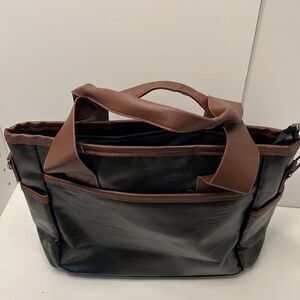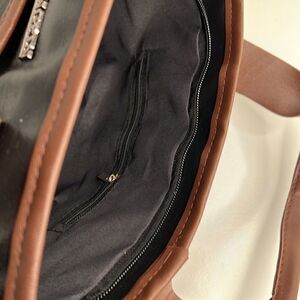 Zip pocket on each long side of the bag and open pockets on the ends of the bag. Inside is a standard tote with one side zipper pocket. This handbag is faux leather and easily wipes clean. Perfect foe everyday use or travel as a carry-on.