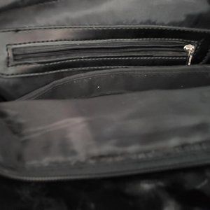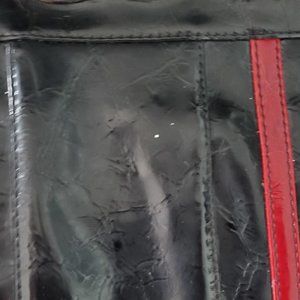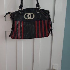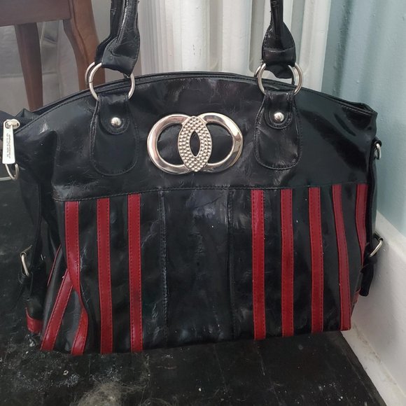 Black and red purse by "Jinry"". 12" long x 14" wide with 2 straps, each 18" long end to end so drop is 9". One outside zippered pocket and two inside plus a center divide.