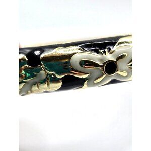 Very pretty Black White and Gold Butterly Floral Enamel Hinged clamper Bracelet by Jiu Long Xing. Signed. Vintage.