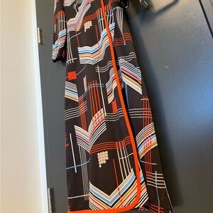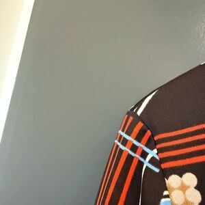 Joan Curtis size 12 great vintage condition some wear its old… but overall great! I am a standard size 6 and it’s one or two sizes too large- so though it’s marked “12” see measurements- it seems to fit 8-10 great!!! This dress showcases a striking geometric pattern in black and white, perfect for casual or work settings. It features long bishop sleeves and a classic crew neck, offering a blend of style and comfort. The continuous pattern adds a modern touch to this elegant dress.