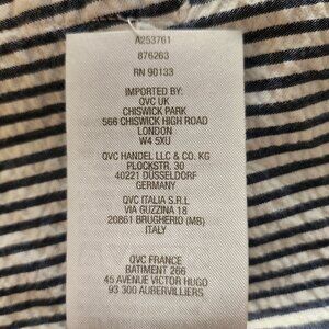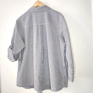 Classic and comfortable Joan Rivers striped shirt in size 2X. This relaxed-fit button-down features vertical navy and white stripes, front pockets, and roll-tab sleeves for an effortless look. Unrolled sleeve is 3/4 length. Made from 100% cotton, it's lightweight and breathable—perfect for layering or wearing on its own. Machine washable. Made in China.