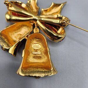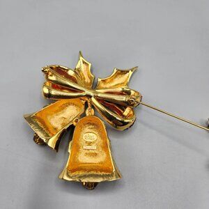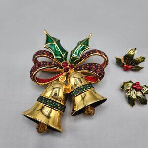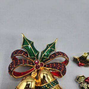 Joan Rivers Christmas Bell Brooch + Holly Clip On Earrings Gold Tone Enamel