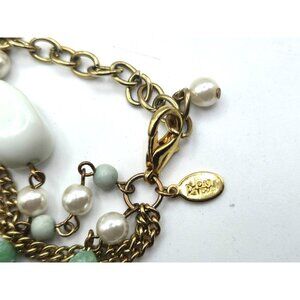 Elegant Joan Rivers signed multistrand necklace, measuring approx. 34". Features layers of faux pearls, frosted green and white resin beads, faceted crystals, and gold-tone chain. Accented with bezel-set green crystal stations for added sparkle. Lobster clasp with Joan Rivers hang tag. Multi-layer design creates a bold statement look, versatile for evening or day wear. Excellent vintage/preowned condition with minimal signs of wear.