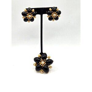 Joan Rivers Signed Vintage Brooch and Earrings Set Onyx + gold faux pearls