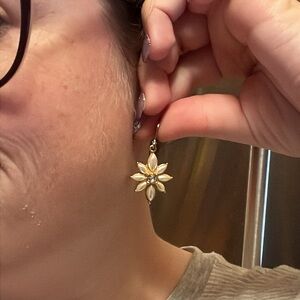 These stunning earrings feature a delicate flower design with white petals and a gold finish. Perfect for adding a touch of elegance to any outfit.