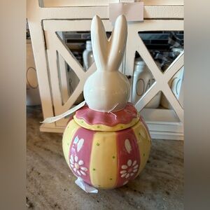 Adorable bunny cookie jar with pink and yellow stripes. Features a cute bunny face and floral accents.