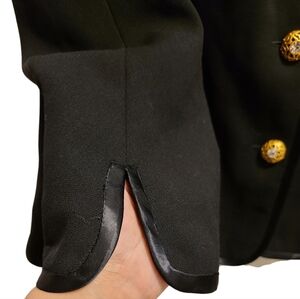 Gorgeous vintage blazer with satin trim on hem, cuffs, collar, etc. Large gold buttons, including a spare button inside. 100% Virgin Wool exterior with an Acetate (made from wood pulp) lining. Very high quality. Made in Germany and the brand is from the UK. Excellent vintage condition. Pockets are still mostly stitched closed. Has shoulder pads.