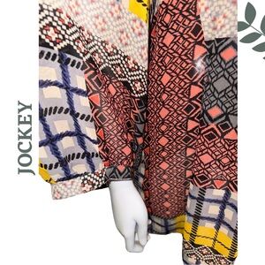 Channel effortless boho vibes in this Jockey printed tunic, featuring a mix of tribal and geometric patchwork patterns in bold hues of coral, mustard, navy, and black. Soft and lightweight, this flowy top is designed with lace detailing at the neckline for a romantic touch. Perfect for layering over leggings or jeans, or even worn open as a beach or lounge cover-up.