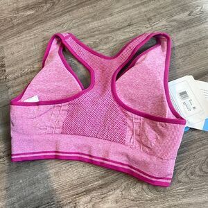 Seamless plunge sport bra provides wire-free supportHalterMolded cups with removable padsPull-on styleMedium supportNylon/SpandexMachine wash