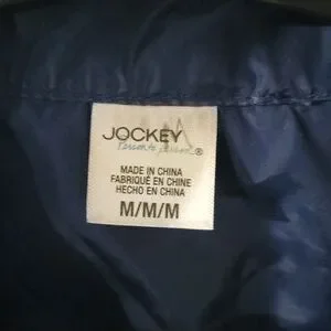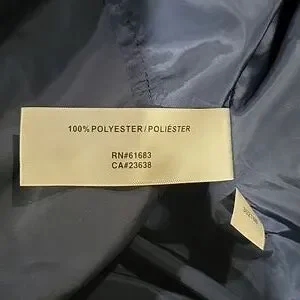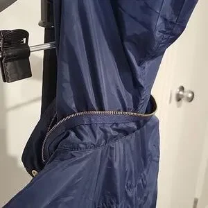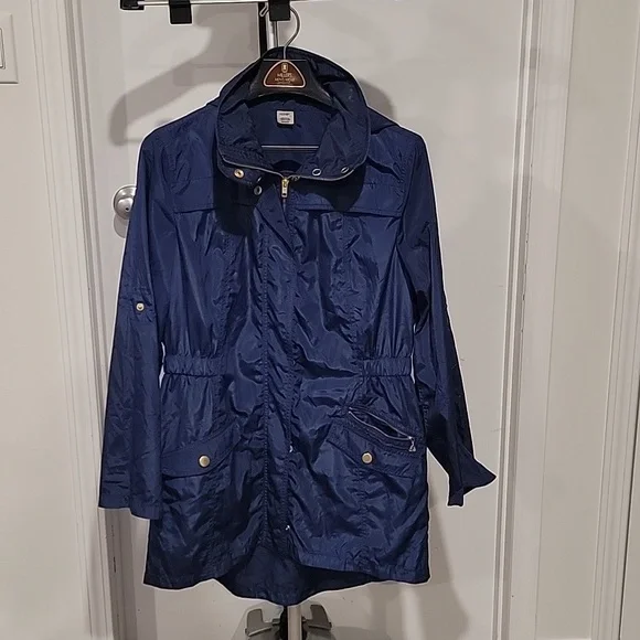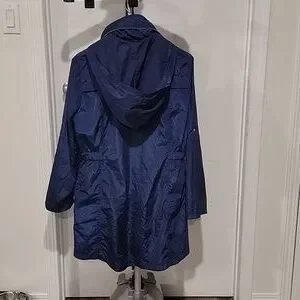 Thin and light water repellant spring coat. Nice sheen to the navy colour and flashy gold accents. The hood can be zipped into the back.