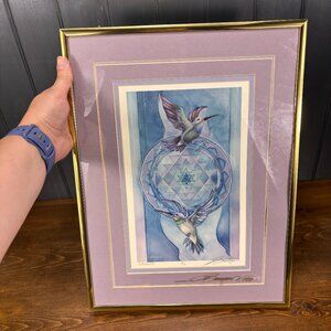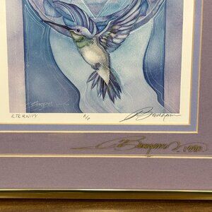 Framed and signed Artist’s Proof (A/P) print titled “Eternity” by Jody Bergsma, featuring two hummingbirds in flight around a mandala. The soothing colors and spiritual symbolism make it ideal for nature lovers, peaceful spaces, or as calming wall art in a nursery or child’s room.