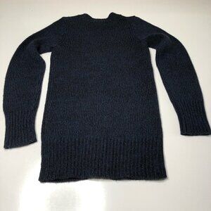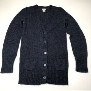 Joe Fresh long knit cozy and warm button up cardigan in a heathered deep navy color. Grandpa sweater vibe and feels thick and luxurious. The heathered speckling is mixed with navy and black. It is stretchy and thick material. Its neckline is a deep-v and it has two pockets on the front and five navy buttons. The neckline, cuffs and bottom hem are a thick ribbed texture. In excellent used condition with no flaws. See photos for measurements and details. Women’s size XSMALL.