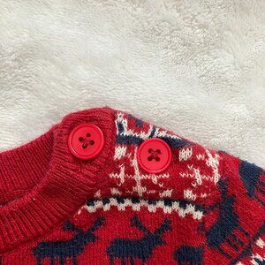 Joe Fresh baby sweater, 6-12M holiday knit, Fair Isle baby sweater, red navy reindeer sweater, EUC baby clothes, Joe Fresh toddler, 6-12 months holiday outfit, Fair Isle pattern baby, snowflake knit sweater, Christmas baby sweater, winter baby layer, cozy holiday top, festive baby fashion, shoulder button baby sweater