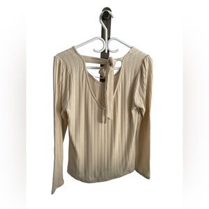 Full length sleeves too. Ribbed detailing all throughout, v-neck line on both sides. Tie on backside, very stretchy, cream in colour. Gently used, in good condition.