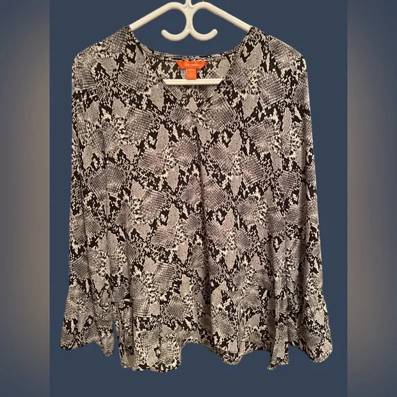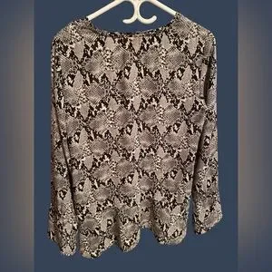 Fashion flutter snake print blouse. V-neckline with flutter detailing on cuffs and hem of blouse. Has a peplum style, no stretch, fits a size bigger than normal. Gently used, in good condition. Pit to pit measures 19” w/o stretch.