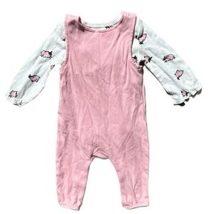 Pink/white 2 pc outfit includes long sleeve diaper shirt/onesie & pink snap cotton overalls.