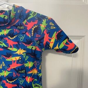 Vibrant baby swimsuit by Joe Fresh. Features a colorful pattern with blue, green, and orange dinosaur accents. Size 12-18 months. In Good Used Condition. Perfect for sun protection.
