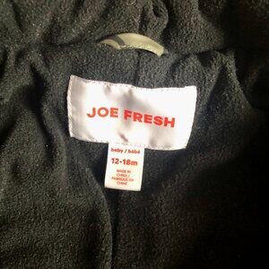 Adorable Joe Fresh baby snowsuit in size 12–18 months. Cute dinosaur camo print with black fleece lining and hood featuring 3D dino spikes. Full front zipper for easy dressing. Warm, cozy, and perfect for winter walks, stroller rides, or outdoor play. In excellent preowned condition, no stains or tears.