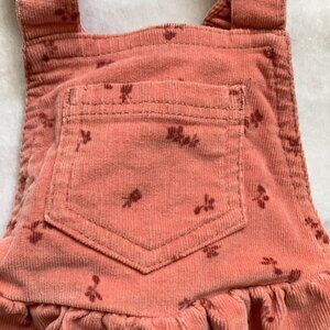 Joe Fresh overall toddler dress size 12-18 months. Material: 98% cotton, 2% spandex. Coral pink corduroy fabric with a subtle floral print, elastic straps, and a front pocket.