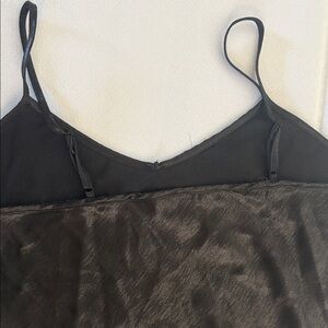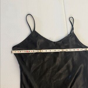 Sleek black satin chemise. Perfect for a stylish night in. Comfortable and flattering fit.